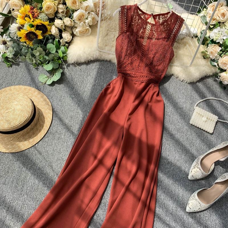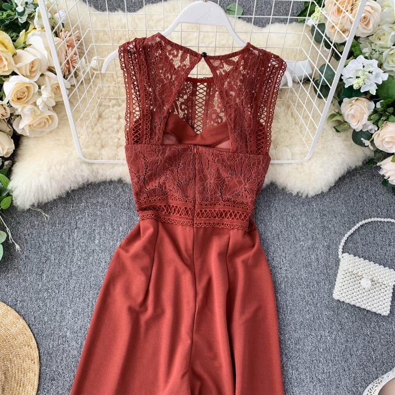 胸元のレースが艶やかなパンツドレス。