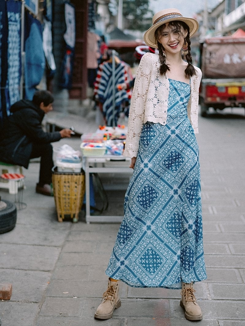 フローラル柄のボヘミアンエスニック風のワンピース。