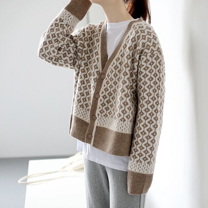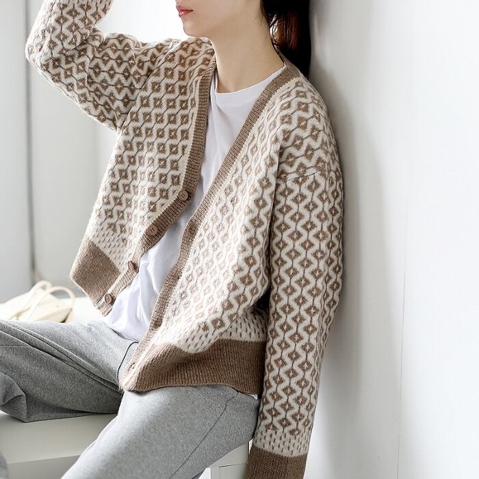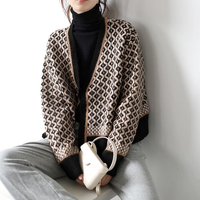 今季トレンド、レトロカジュアルなダイヤ柄のニットカーディガン。