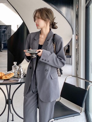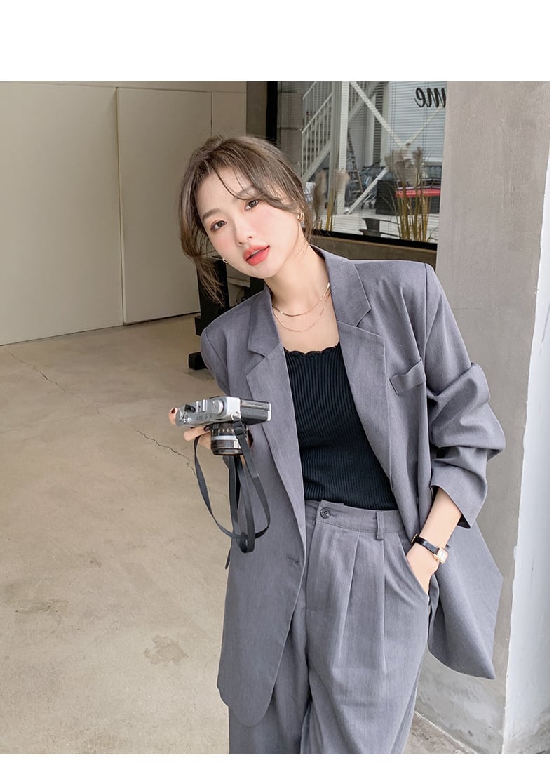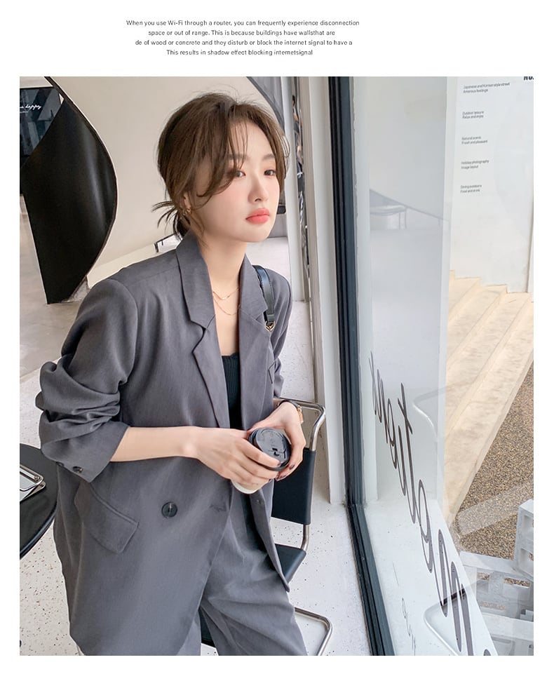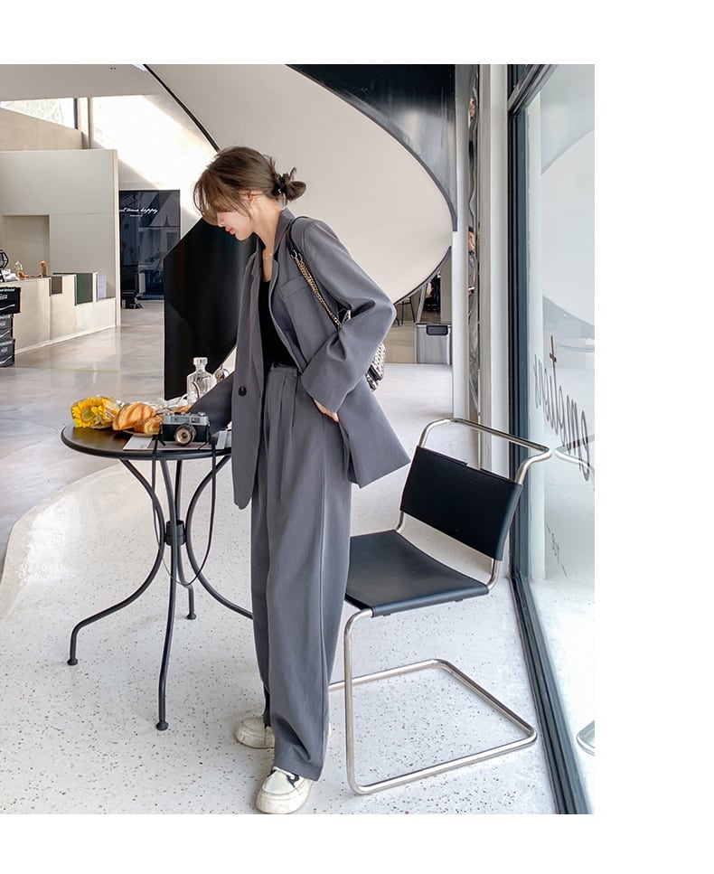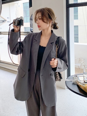 シンプルなジャケット+ワイドパンツのセットアップ。