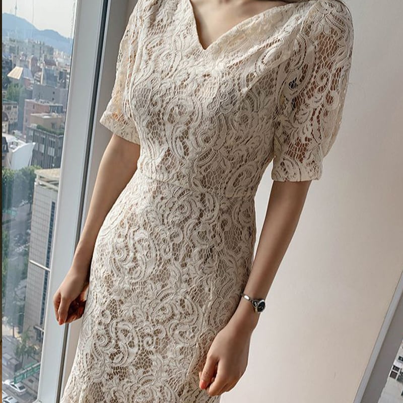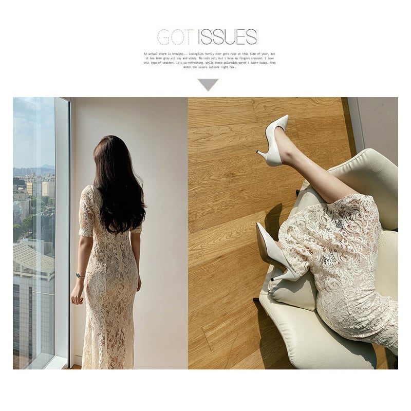 エレガントな繊細総レースの半袖ロングワンピースです。