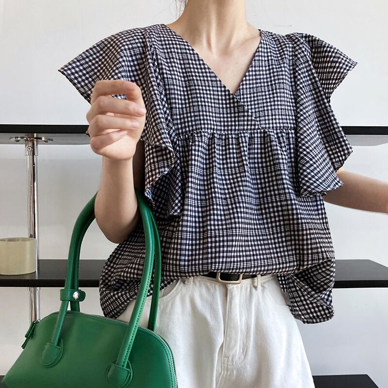 春新作 ブラウス レディース シャツ ブラウス 韓国 春 秋 冬 無地 大人可愛い フォーマルブラウス オフィス 韓国ファッション レディーストップス フレンチスリーブ 体型カバー ゆったりシルエット ギンガムチェック 30代 40代