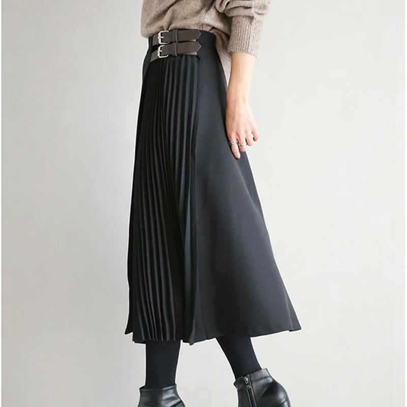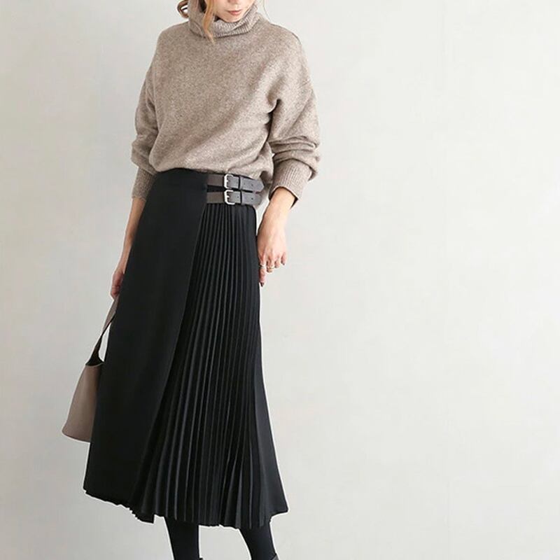 プリーツやファイクレザーベルトなど、こだわりポイントが沢山入っています。