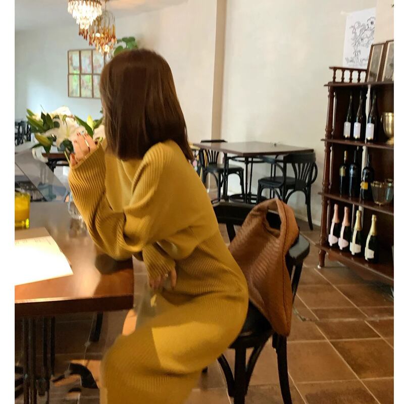 ワンピース 春 秋 冬 ロング ロングワンピース レディース ロング丈 長袖 ニットワンピース タイトワンピース リブ加工 韓国ワンピース 20代 30代 シンプル 大人可愛い きれいめ イエロー グレー