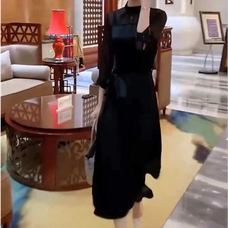 光沢のある生地とシースルー生地のミックスされたパーティードレス。