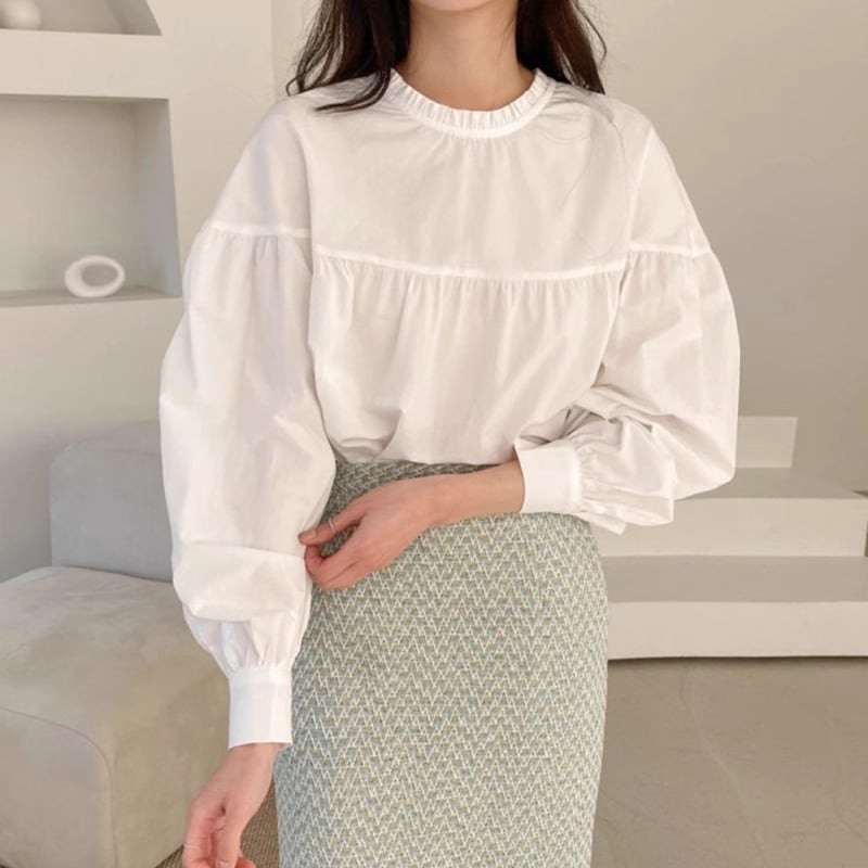 フリルネックが愛らしい長袖ブラウス。