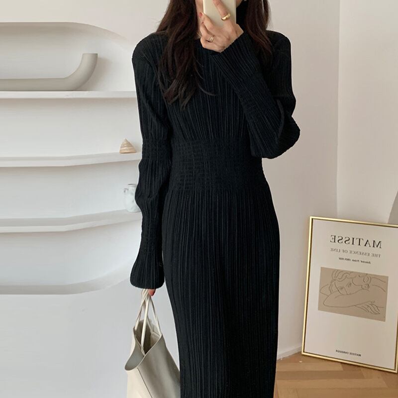 細めのプリーツで縦のラインが美しいブラックワンピース。