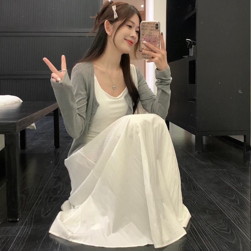 涼やかなホワイトのキャミソールとロングスカートに落ち着いたグレーのカーディガン。