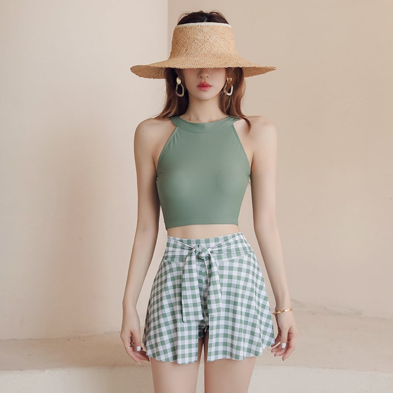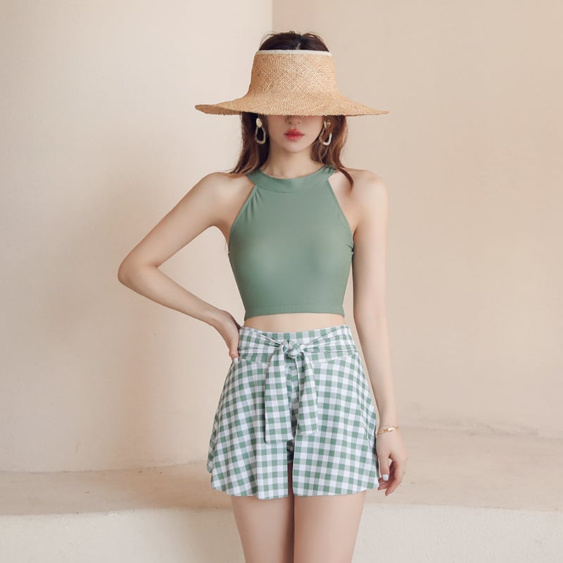 水着 ビキニ 水着ビキニ 2点セット 韓国 水着 スカート付き マイクロビキニ グリーン 20代 30代 無地 チェック プール 海 温泉 体型カバー